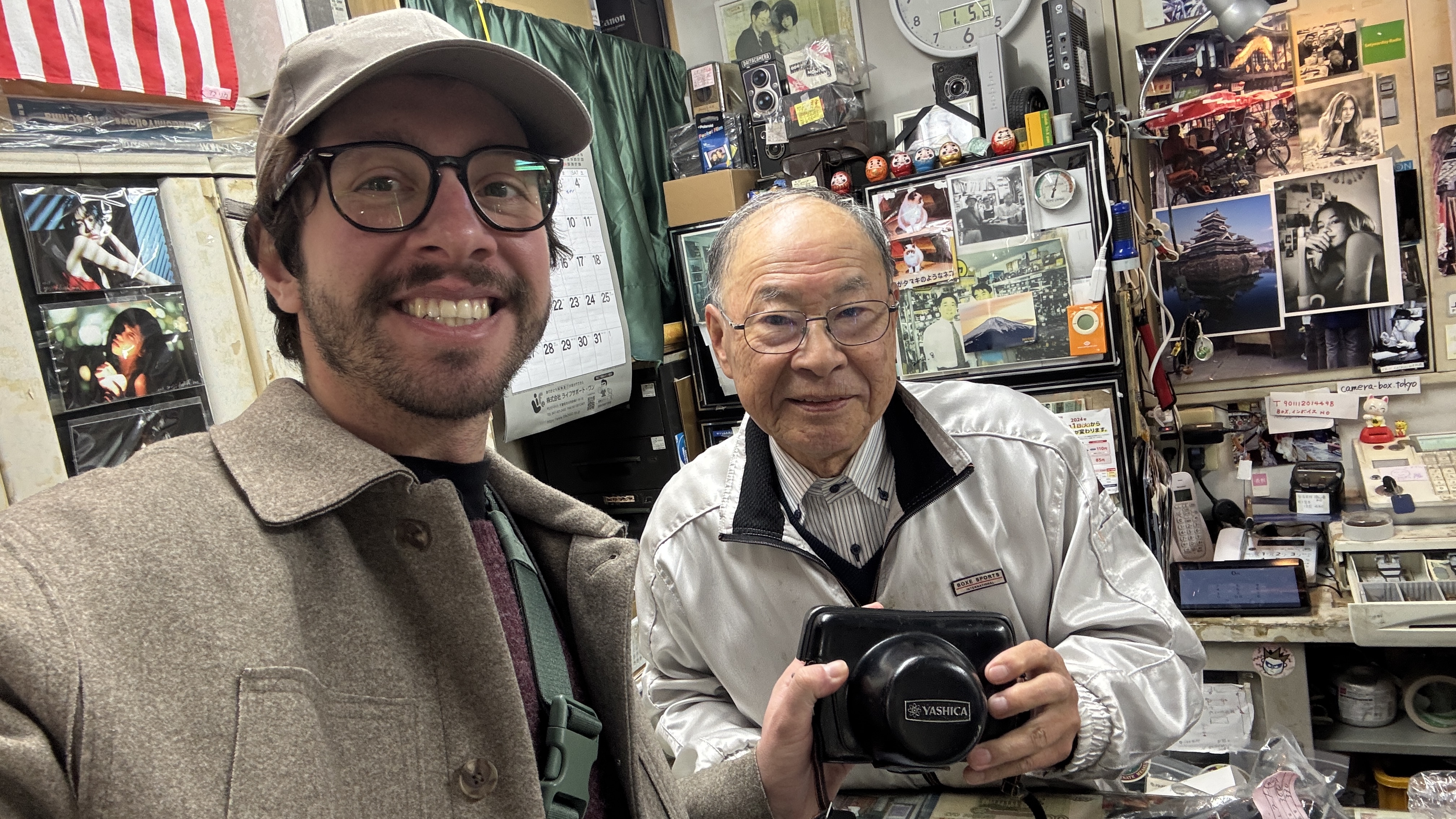 Buying a Yashica film camera and case at a camera shop in Tokyo: